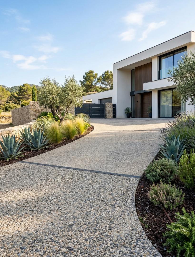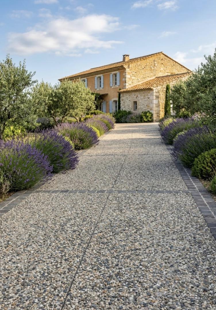 À Montpellier et ses alentours, le béton désactivé est particulièrement apprécié pour sa faible absorption de chaleur par rapport à l'enrobé noir. France Revet Montpellier assure une pose dans les règles de l'art : terrassement, mise en place du ferraillage, coulage et lavage haute pression précis pour un rendu uniforme.
