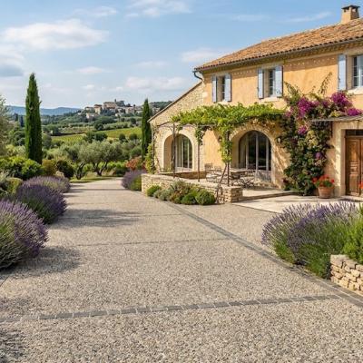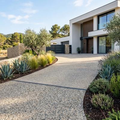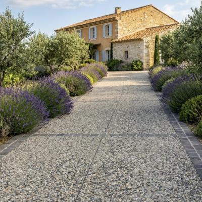 Le béton désactivé est obtenu par la pulvérisation d'un désactivant sur la surface du béton frais, permettant de laisser apparaître les granulats après lavage. C'est le choix privilégié pour les accès carrossables grâce à sa résistance exceptionnelle et son aspect esthétique qui ne s'altère pas avec le temps.