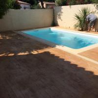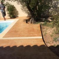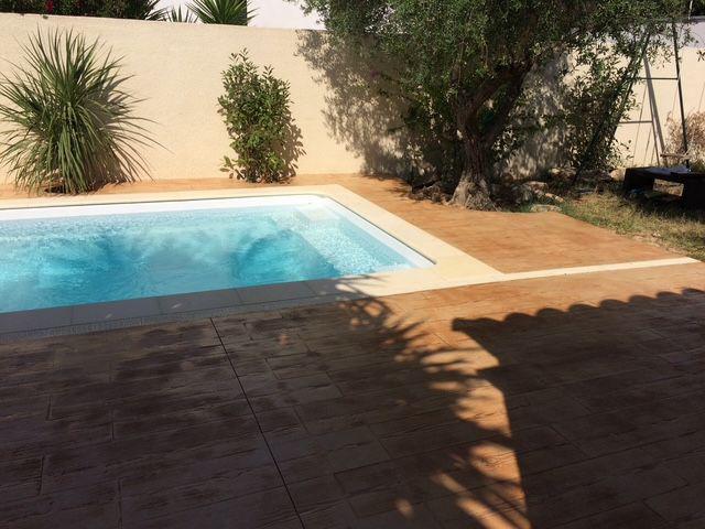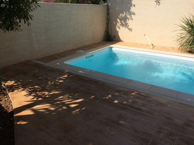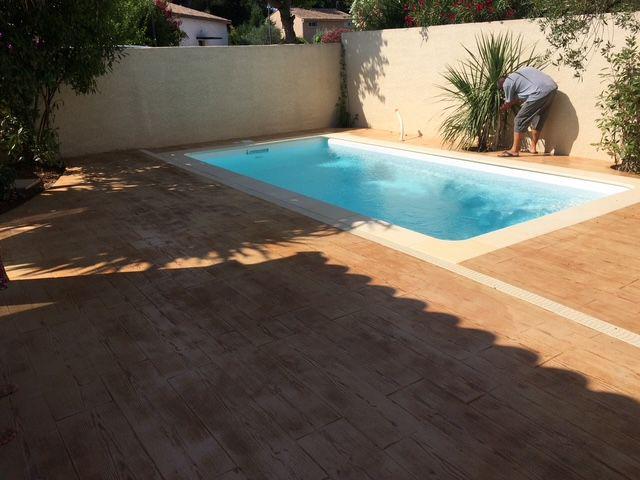 FRANCE REVET MONTPELLIER a achevé la création d'une plage de piscine d'exception à Lansargues. Pour ce projet, nous avons mis en œuvre un béton imprimé imitation bois, offrant la chaleur visuelle du parquet extérieur sans les contraintes de déformation ou d'entretien du bois naturel.