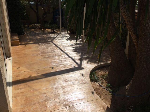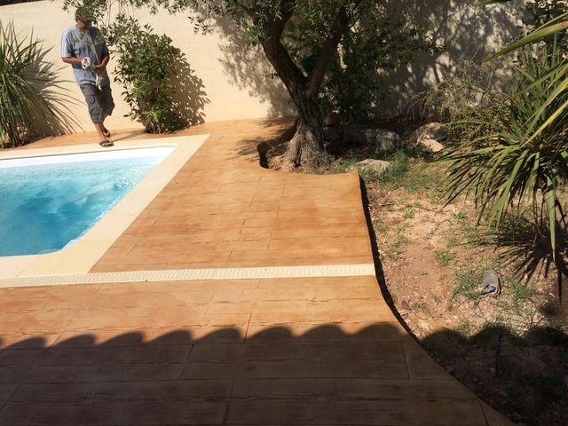 "Le béton imprimé à Lansargues combine l'esthétique noble du bois et la robustesse du béton pour une terrasse de piscine pérenne."